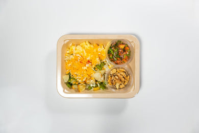 Cheesy Tofu Scramble with Potato Hash (Full Nutrition)