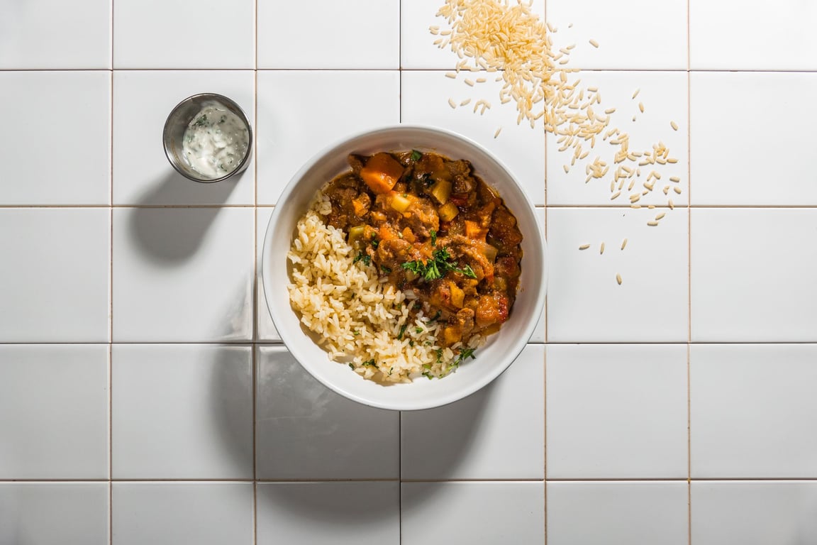 Ingredients: beef (sirloin tip), brown rice, crushed tomato, beef stock, sour cream, turnip, onion, celery, carrot, potato starch, tomato paste, extra virgin olive oil, garlic, parsley, parsley, chives, cilantro, lemon juice, caraway, salt, black pepper, paprika, salt