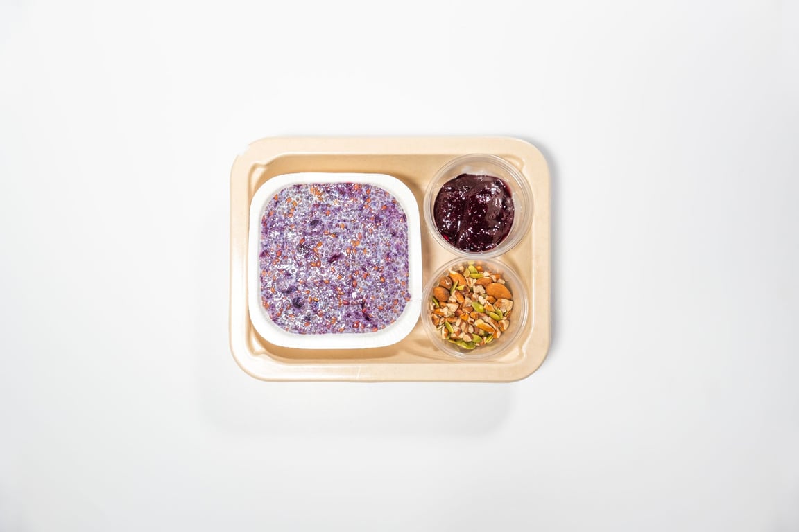 Ingredients: coconut plant-based beverage, blueberries, chia seeds, blueberries, flax seed, hemp seeds, pumpkin seeds, almonds, pecans, lemon juice, cinnamon