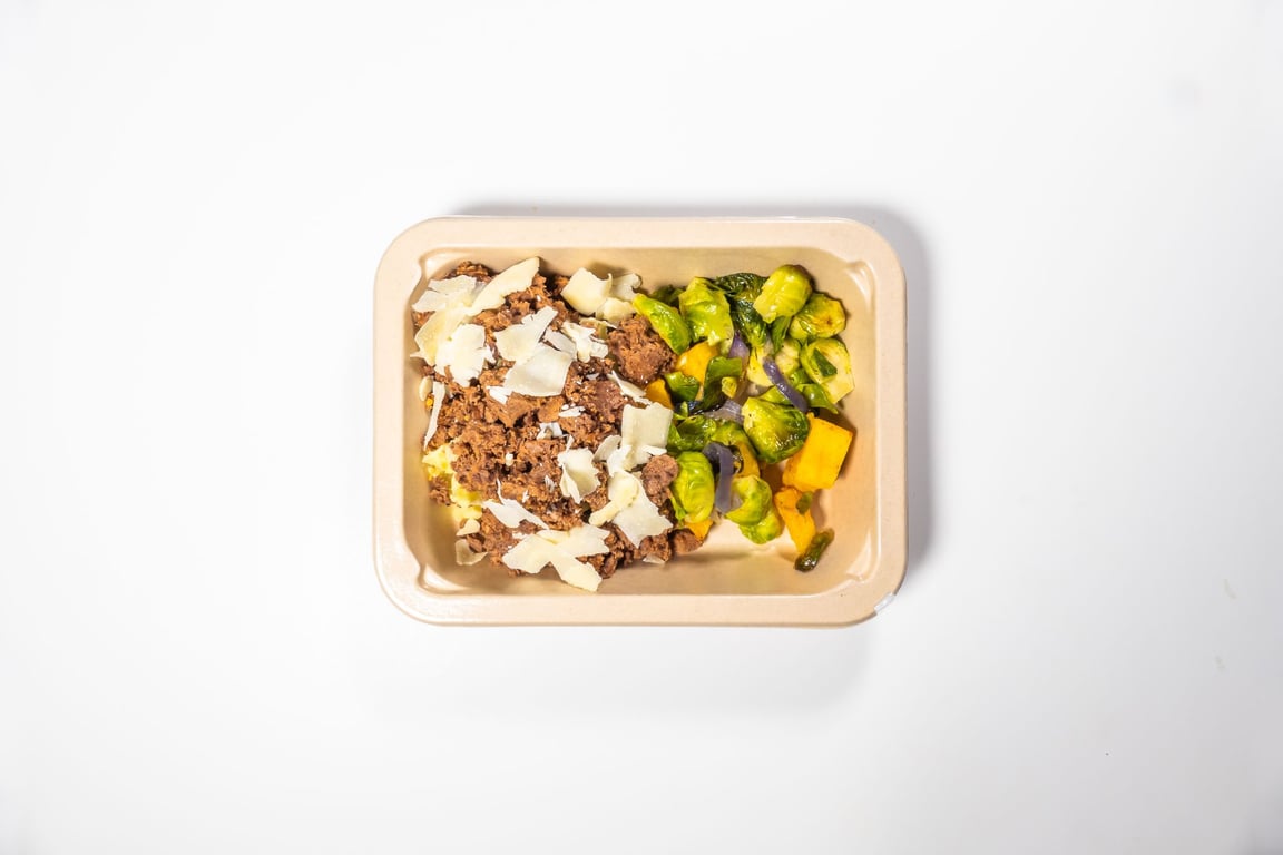 Ingredients: beef (sirloin tip), sweet potato, brussel sprouts, butternut squash, parmesan cheese, 2% milk, red onion, butter, green onion, tomato paste, oil, salt, black pepper, beef stock, potato starch