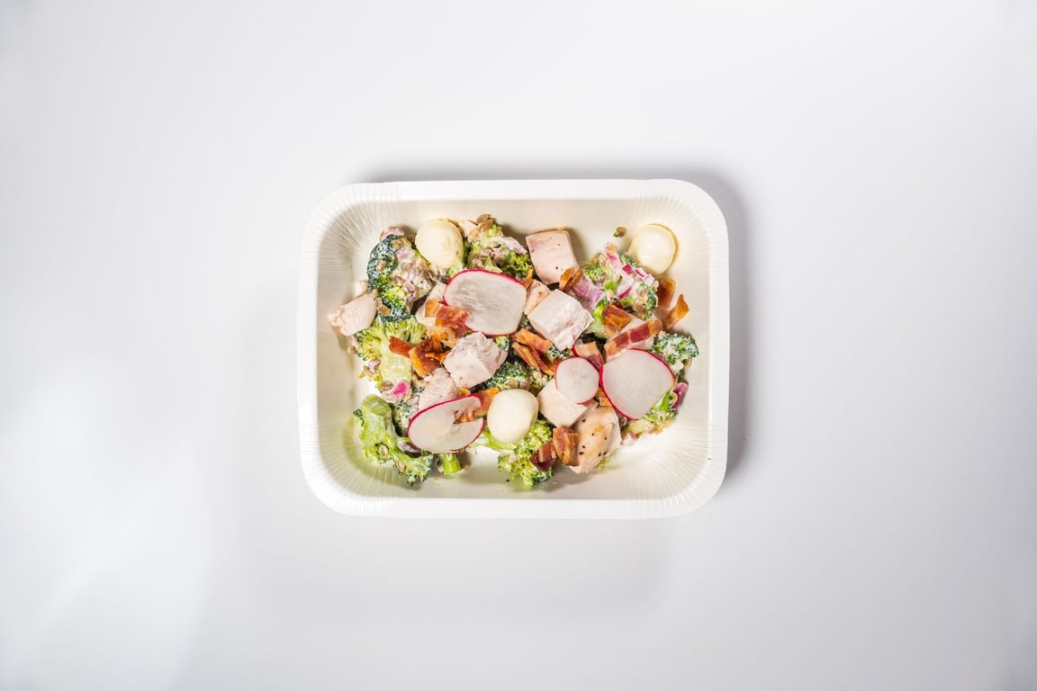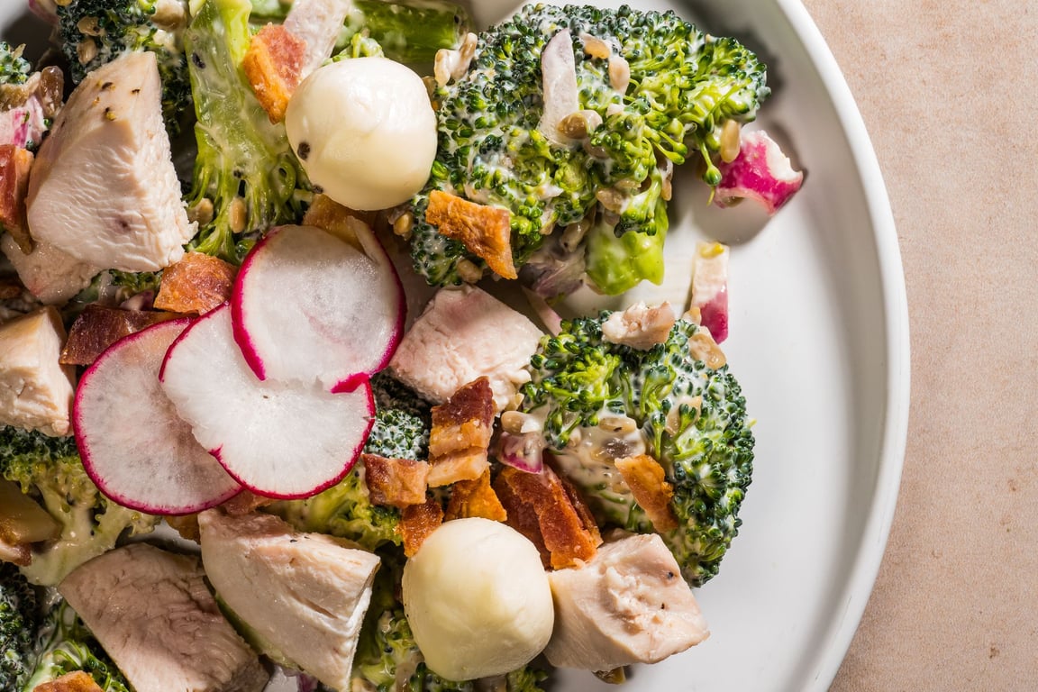 Ingredients: broccoli, chicken breast, mayonnaise, sour cream, bocconcini cheese, bacon, sunflower seeds, radish, red onion, dijion mustard, lemon juice, chives, extra virgin olive oil, oil, lemon juice, salt, salt, salt, black pepper, black pepper, black pepper