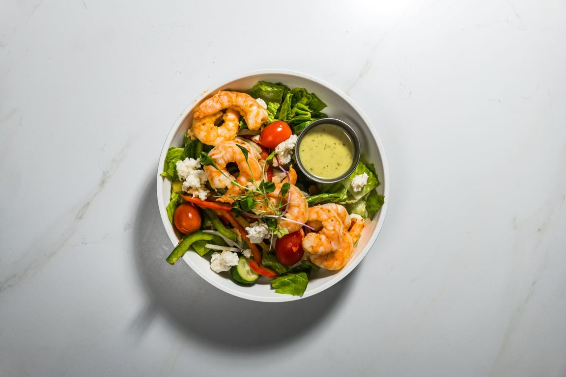 Ingredients: shrimp, romaine lettuce, cucumber, extra virgin olive oil, bell pepper mixed, cherry tomato, feta cheese, lemon juice, fennel, dijion mustard, oil, apple cider vinegar, garlic, lime juice, microgreens, cajun seasoning, monkfruit, parsley, lemon zest, salt, black pepper