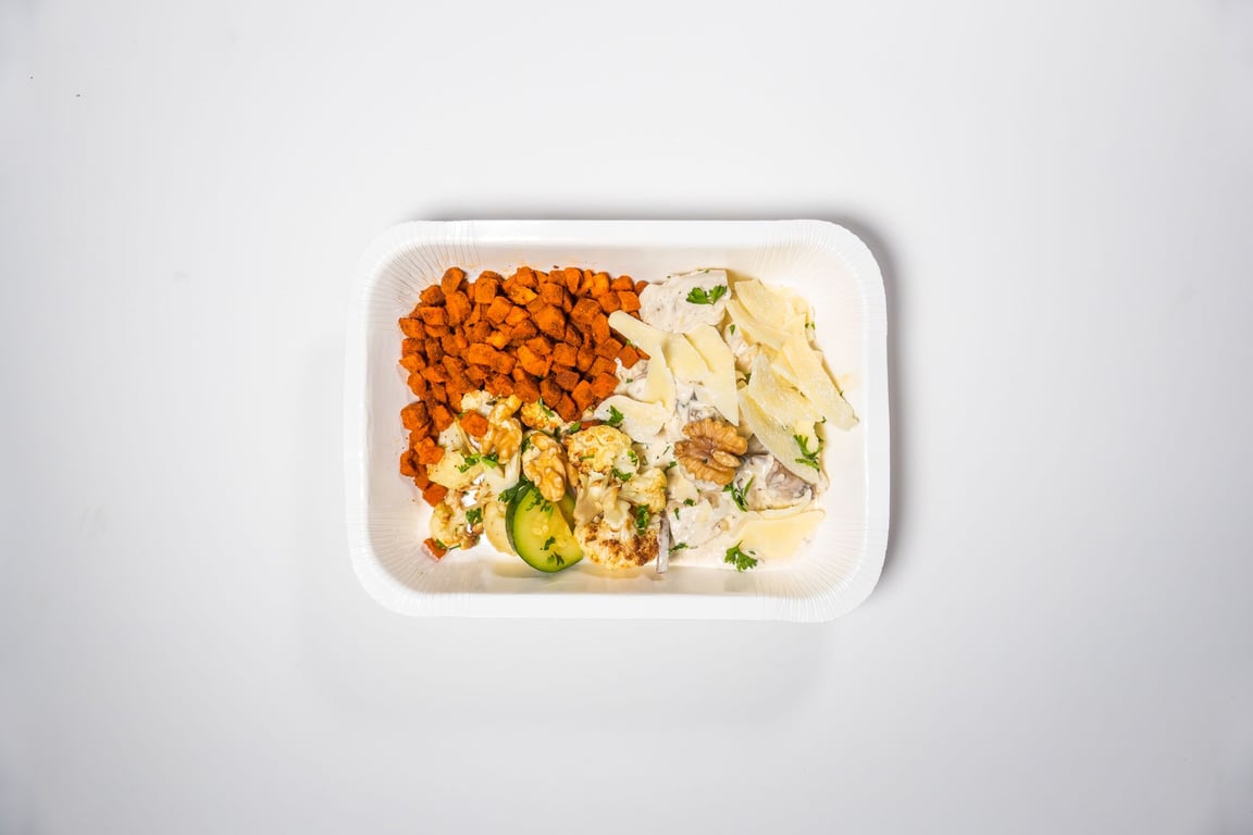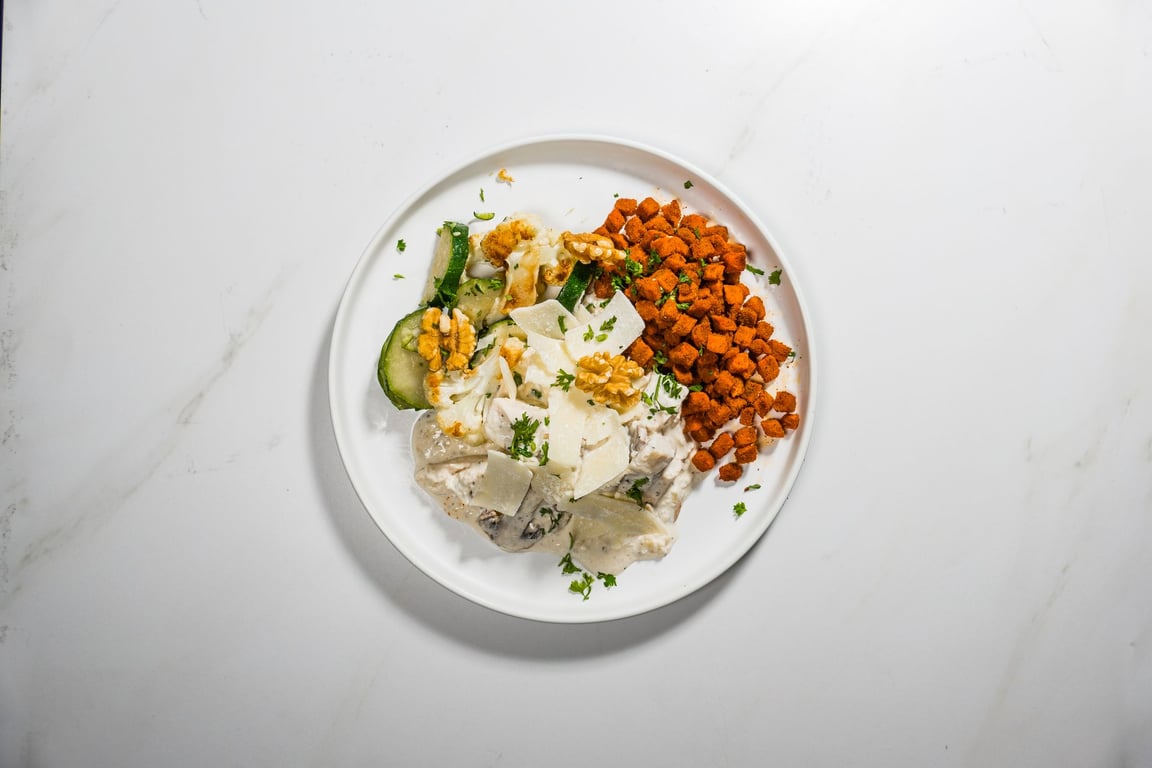 Ingredients: chicken breast, turnip, heavy cream, cauliflower, zucchini, mushroom, parmesan cheese, butter, parmesan cheese, walnuts, white wine, extra virgin olive oil, onion, extra virgin olive oil, oil, chives, parsley, garlic, garlic, fresh thyme, rosemary, nutmeg, paprika, black pepper, black pepper, salt, salt, salt, bay leaves
