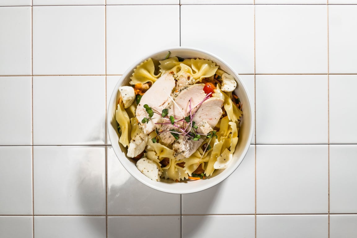 Ingredients: chicken breast, pasta, cherry tomato, cucumber, bocconcini cheese, arugula, extra virgin olive oil, carrot, fennel, sun-dried tomato, water, red onion, lemon juice, dijion mustard, arugula, extra virgin olive oil, garlic, microgreens, extra virgin olive oil, lemon juice, extra virgin olive oil, italian seasoning, salt, black pepper, salt, black pepper
