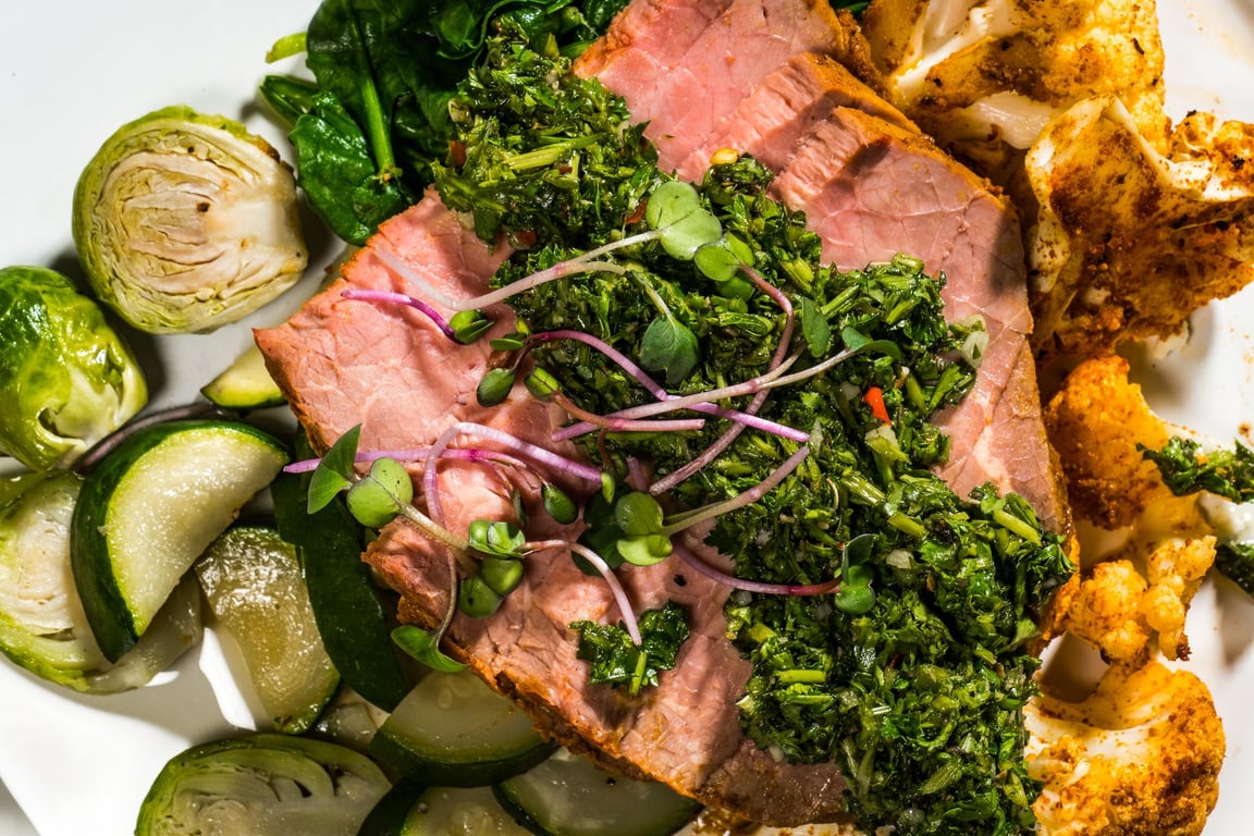 Ingredients: beef (eye of round), cauliflower, brussel sprouts, spinach, zucchini, extra virgin olive oil, parsley, cilantro, apple cider vinegar, garlic, extra virgin olive oil, microgreens, extra virgin olive oil, lime juice, oregano, salt, salt, red chili flakes, black pepper, black pepper, taco seasoning, smoked paprika, cumin, salt