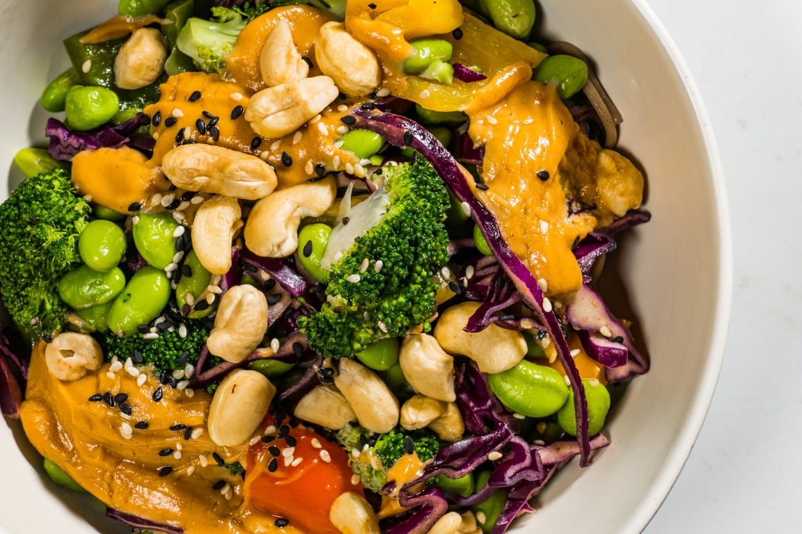 Ingredients: soba noodles, edamame, broccoli, mixed bell pepper, red cabbage, peanut butter, cashews, water, sesame oil, tamari soy sauce, sambal chili paste, extra virgin olive oil, tamarind, lime juice, black sesame seeds, white sesame seeds